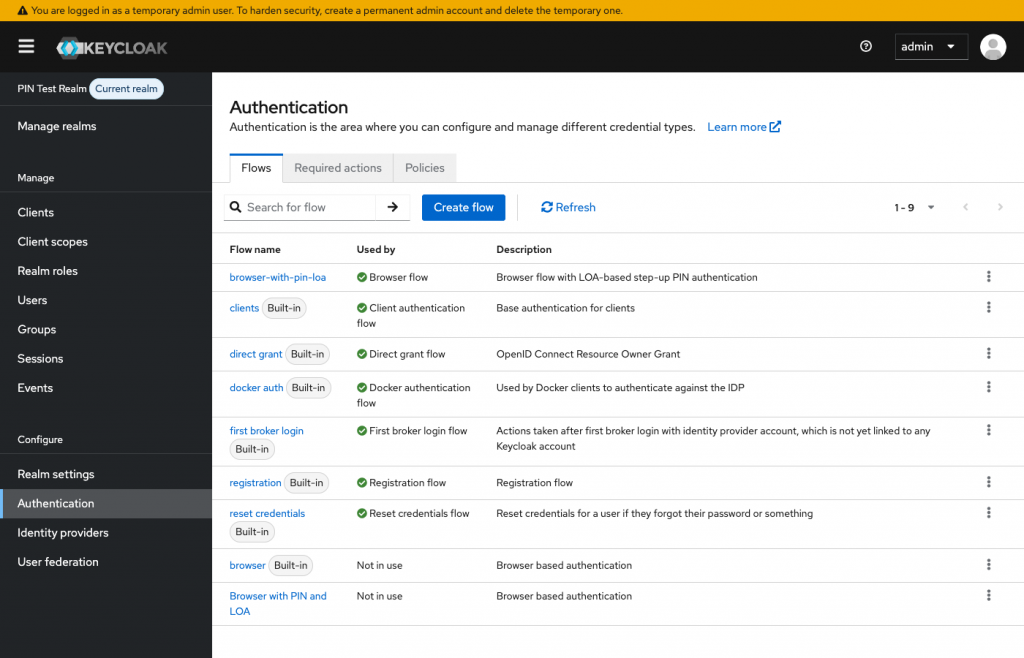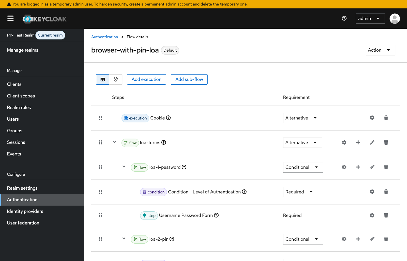 No custom Java code for the locking mechanism. Just Keycloak’s built-in Level of Authentication (LOA) step-up, combined with the PIN Code Authenticator extension.