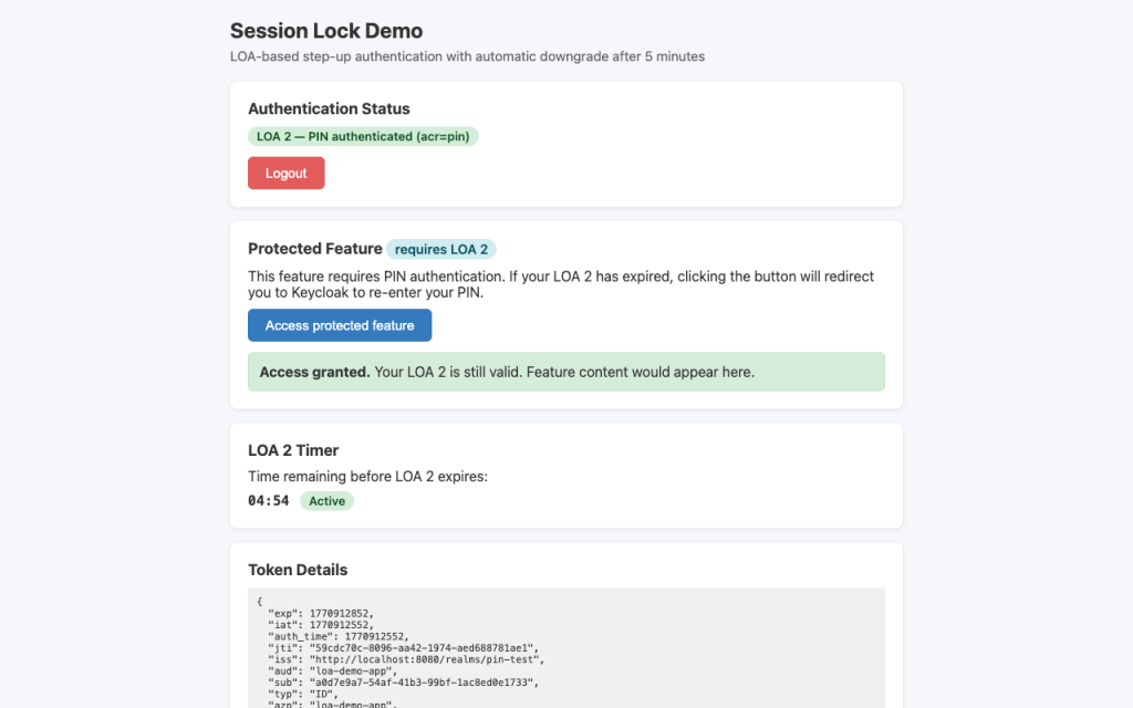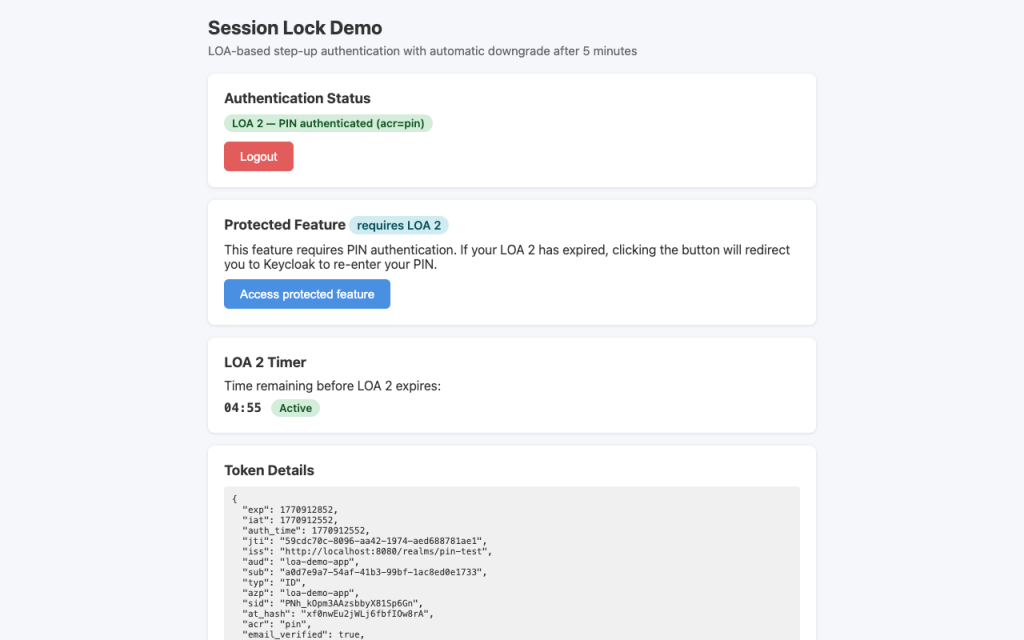 Five minutes pass. The timer runs out. The session is NOT destroyed. But when the user tries to access the protected feature again, the app detects that LOA 2 has expired and redirects to Keycloak for PIN re-entry.