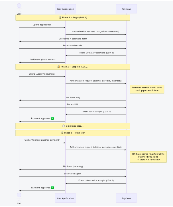 You could even combine multiple step-up levels — LOA 1 for password, LOA 2 for OTP, LOA 3 for PIN — with increasingly shorter timeouts. Keycloak’s conditional flow mechanism supports this natively.