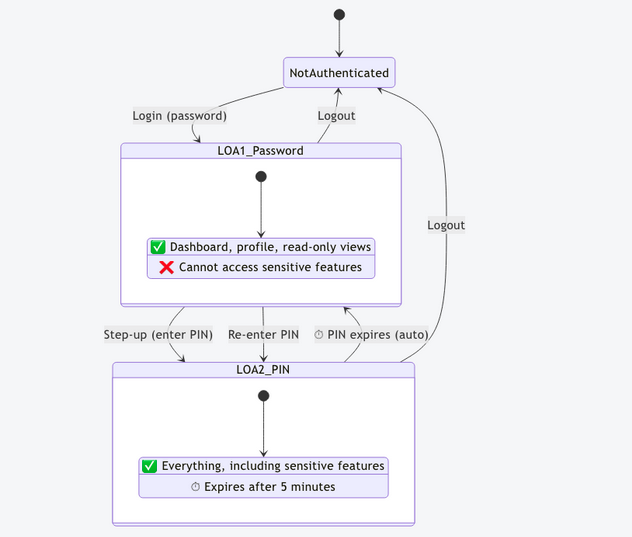 | LOA 2 | Entered their PIN | Everything — including sensitive features | 5 minutes (then auto-expires) |